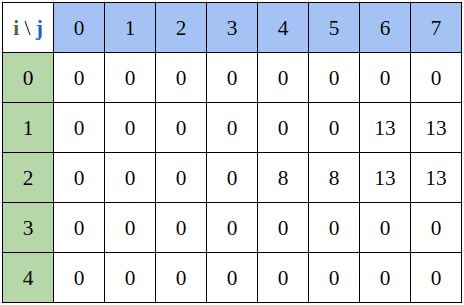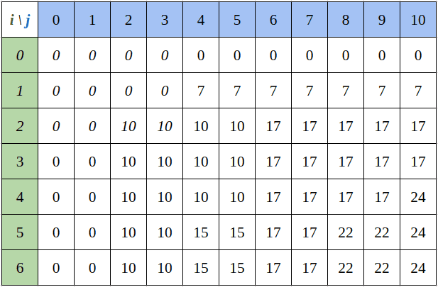 일반적으로 동적 계획법에서 값을 결정하는 변수들의 차원만큼의 행렬에 대응하는 배열을 만들어 사용한다. 이 문제에는 무게와 가치 두 가지 변수가 있으므로 행과 열을 각 변수에 대입하여 만들고 행렬 는 남아있는 물건 중 번째까지의 물건을 용량 의 배낭에 집어넣을 때의 최대 가치를 저장하면 된다.