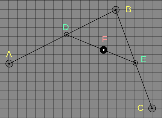 위 과정을 그림을 통해 보면 더블 클릭을 통해 생성한 점들 A, B, C는 coords배열에 담기게 되고 애니메이션을 실행하면 이 배열을 calculatePosition()에서 계산을 한다. 계산을 통해 나온 점들의 좌표가 담긴 calced에는 D, E가 담겨 있고 다시 calculatePosition()을 호출한다. 계산 결과 나온 값이 바로 F가 되고 이 F가 베지어 곡선을 그리는 점이 된다.